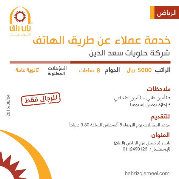 حلويات سعد الدين وظائف خدمة عملاء هاتفيه رواتب 5000 ريال في الرياض